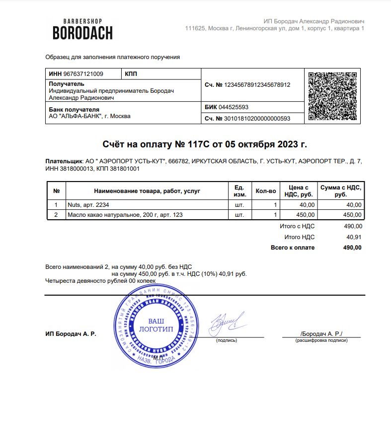 Полученную ссылку вы можете передать клиенту или просто скачать документ в удобном формате: PDF или DOC и передать клиенту файл. Если в сервисе Моё дело у вас настроена интеграция с платежной системой, то клиент сможет по ссылке оплатить счёт онлайн.