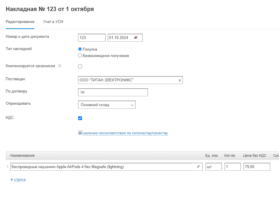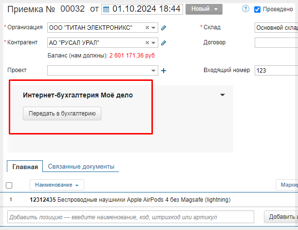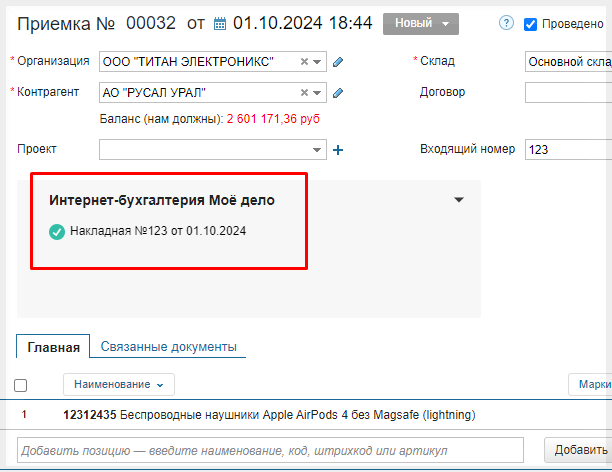 Сформированный документ вы можете проверить в Моем деле. При изменении приёмки в МоемСкладе документ будет автоматически обновляться в сервисе Моё дело.