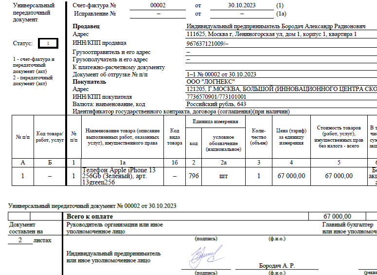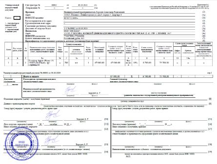 Сформированный УПД вы можете скачать в формате DOC, кликнув на название документа. При изменении отгрузки в МоемСкладе УПД будет автоматически обновляться в сервисе Моё дело.