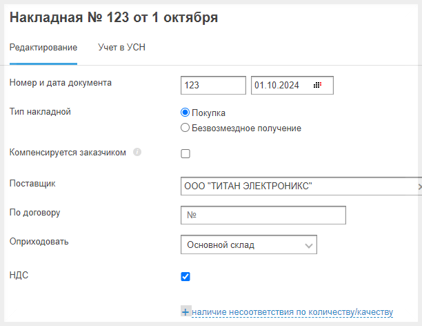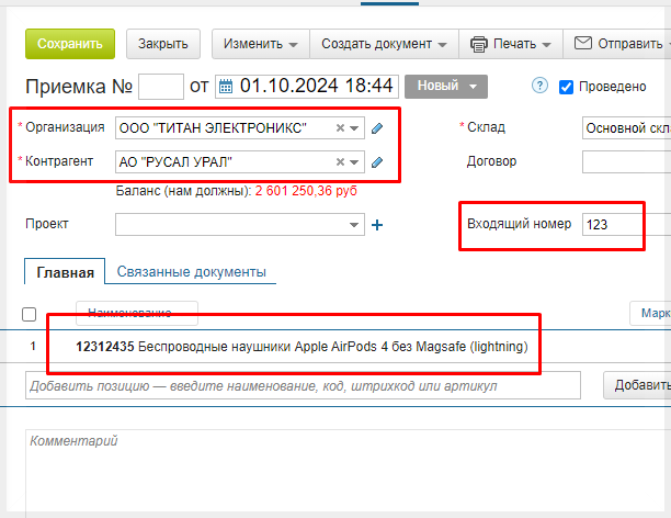 После настройки модуля перейдите в раздел Закупки - Приёмки. Создайте новую приёмку. Заполните обязательные поля: организация, контрагент, номер входящего документа, дата, товар. Нажмите Сохранить.