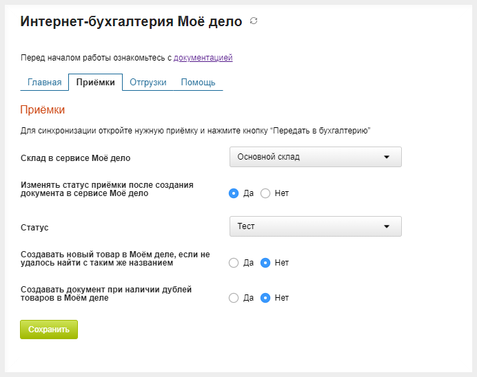 Модуль создает акт, накладную или УПД в сервисе Моё дело для приёмок в системе МойСклад автоматически.