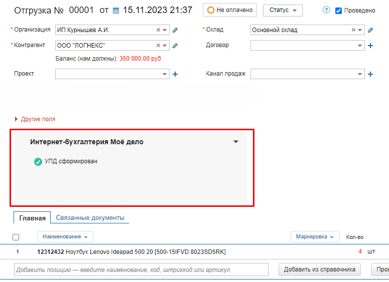 После сохранения отгрузки появится виджет модуля Моё дело, который показывает статус формирования документа. Дождитесь статуса УПД сформирован и обновите страницу.