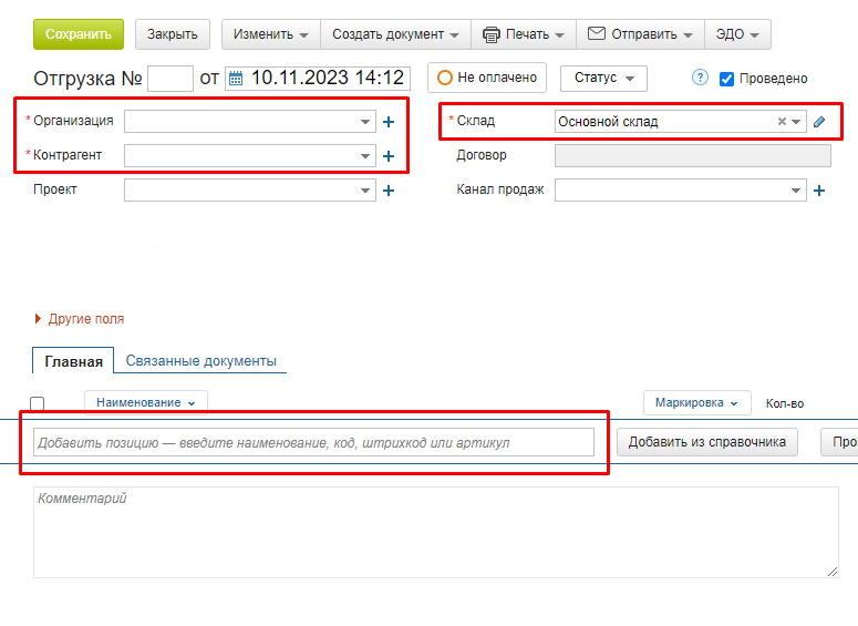 После настройки модуля перейдите в раздел Продажи - Отгрузки. Создайте новую отгрузку. Заполните обязательные поля. Нажмите Сохранить.